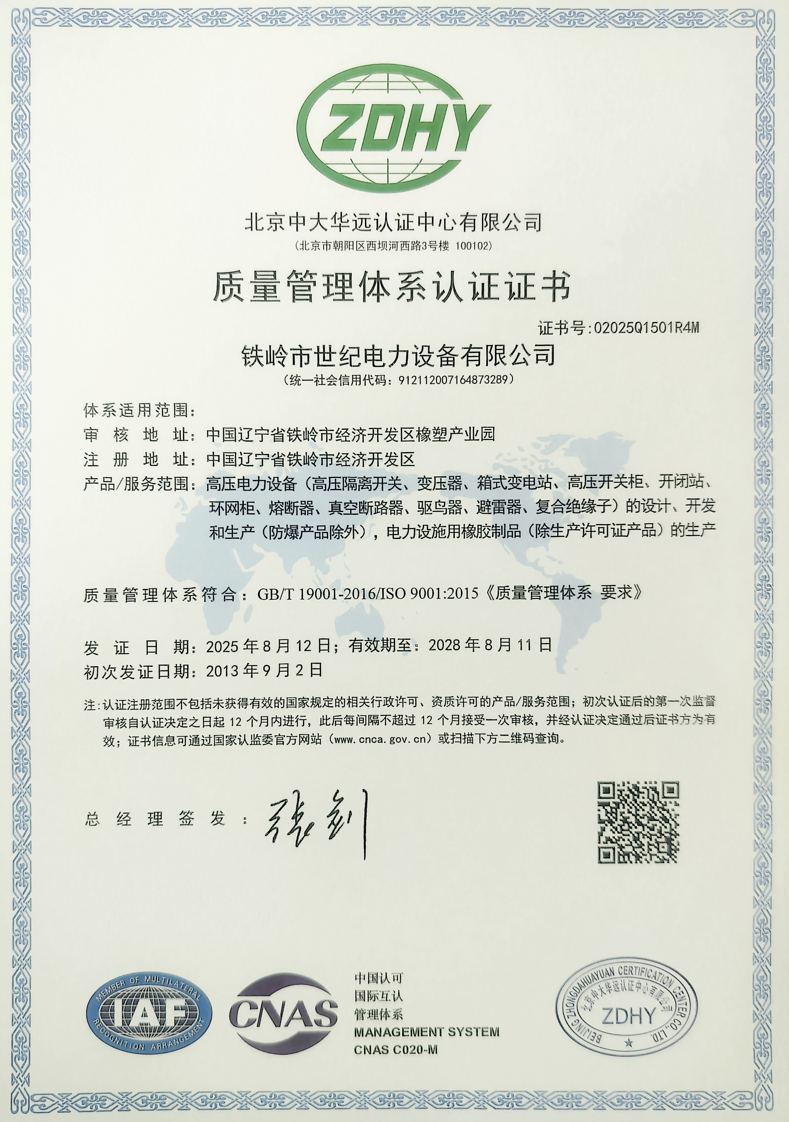 鐵嶺市世紀(jì)電力設(shè)備有限公司是集科研開(kāi)發(fā)、生產(chǎn)制造、用戶(hù)服務(wù)于一體的國(guó)家高新技術(shù)企業(yè),始建于1999年,位于鐵嶺經(jīng)濟(jì)開(kāi)發(fā)區(qū),占地面積5萬(wàn)余平方米,建筑面積2萬(wàn)余平方米。主要從事國(guó)家電網(wǎng)配套戶(hù)外高低壓隔離開(kāi)關(guān)、電力電纜、變壓器成套裝置、高低壓開(kāi)關(guān)柜、箱式變電站、絕緣子等產(chǎn)品的研發(fā)、生產(chǎn)和銷(xiāo)售。公司現(xiàn)有國(guó)家發(fā)明專(zhuān)利6項(xiàng)、實(shí)用新型專(zhuān)利9項(xiàng),公司通過(guò)了ISO9001國(guó)際質(zhì)量管理體系認(rèn)證、ISO14001環(huán)境管理體系認(rèn)證和ISO 45001職業(yè)健康安全體系認(rèn)證。