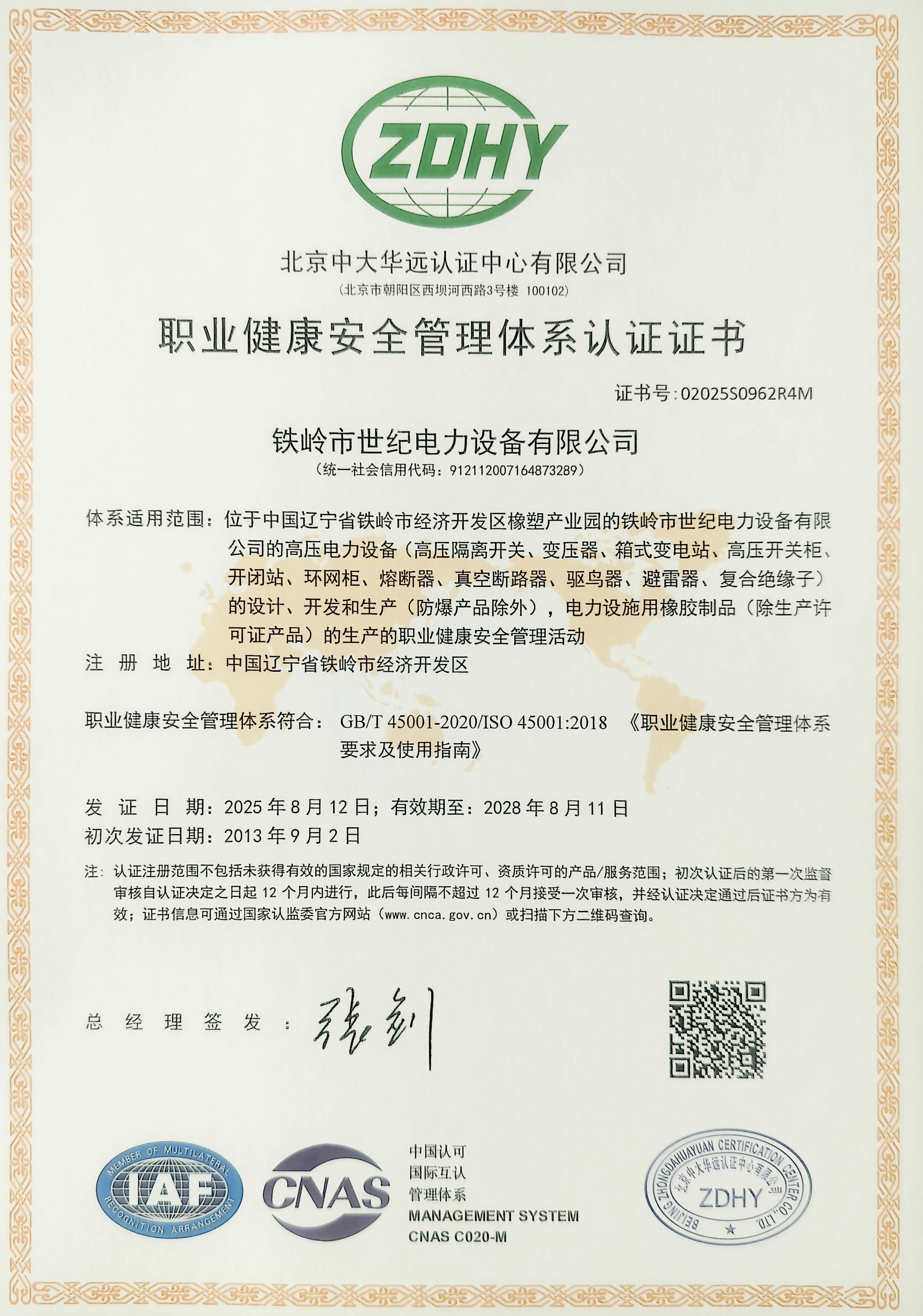 職業(yè)健康安全管理體系認(rèn)證證書